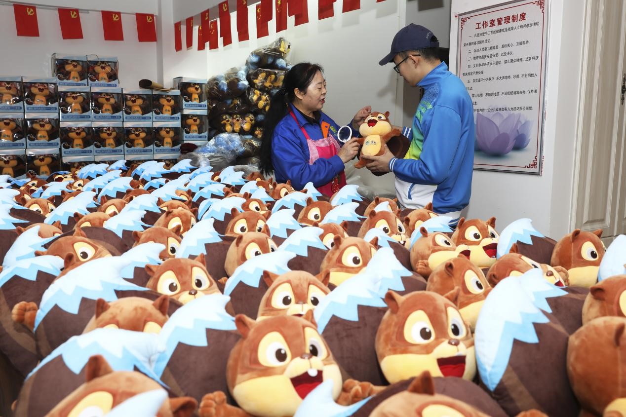 Photo shows stuffed toys in the shape of chipmunk, the mascot of Chongli district, Zhangjiakou city, north China’s Hebei province, made at a workshop eastablished by Chen Suqin (left), a visually impaired woman. The workshop established in 2015 has provided jobs for over 30 local residents with disabilities in Chongli district. Its cultural and creative products, including the chipmunk stuffed toys, are popular among consumers. (Photo by Wu Diansen/People’s Daily Online)