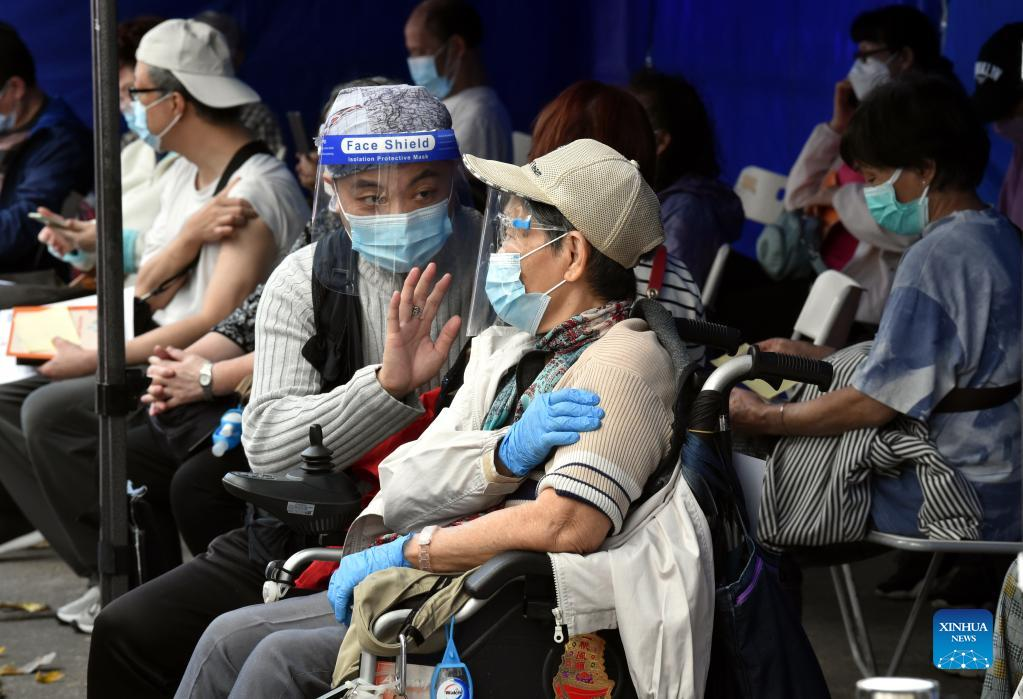 People wearing face masks rest after receiving COVID-19 vaccines at Tai Hing Estate in Tuen Mun, south China's Hong Kong, March 4, 2022. The Hong Kong Special Administrative Region (HKSAR) reported 52,523 new COVID-19 cases and 136 deaths on Friday, official data showed. (Xinhua/Lo Ping Fai)