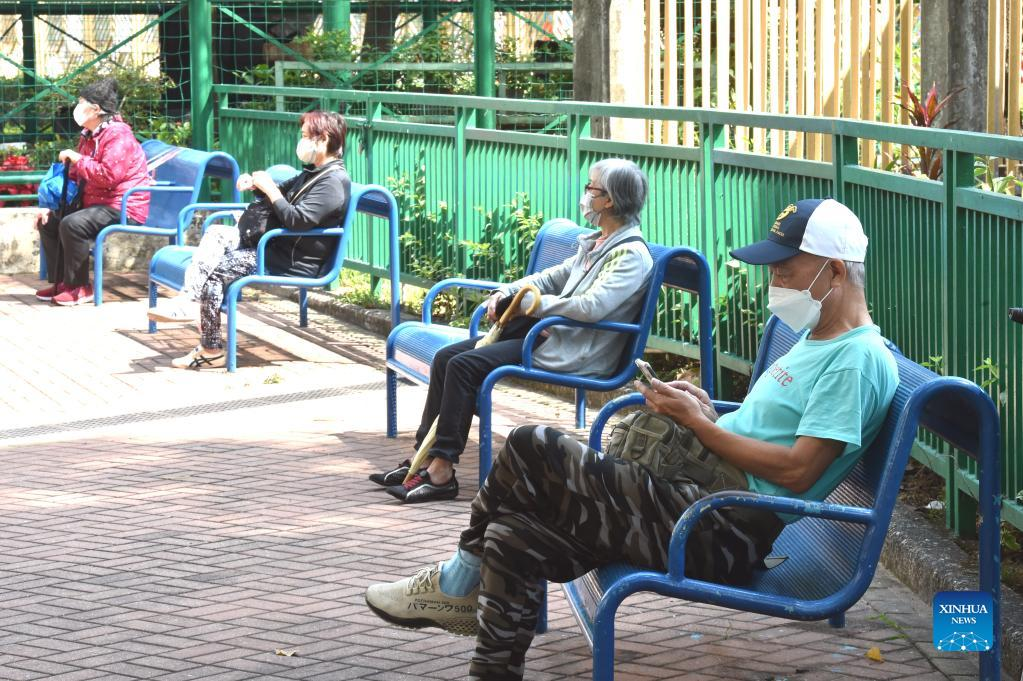 People wearing face masks rest at a park of Tai Hing Estate in Tuen Mun, south China's Hong Kong, March 4, 2022. The Hong Kong Special Administrative Region (HKSAR) reported 52,523 new COVID-19 cases and 136 deaths on Friday, official data showed. (Xinhua/Lo Ping Fai)
