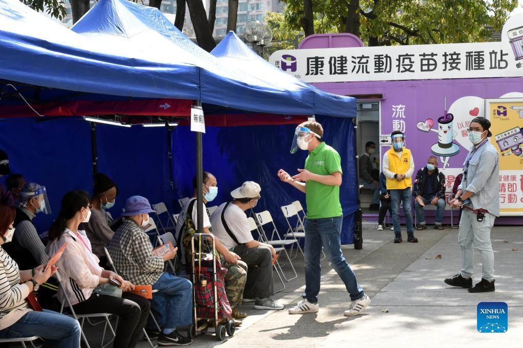 People wearing face masks wait to receive COVID-19 vaccines at Tai Hing Estate in Tuen Mun, south China's Hong Kong, March 4, 2022. The Hong Kong Special Administrative Region (HKSAR) reported 52,523 new COVID-19 cases and 136 deaths on Friday, official data showed. (Xinhua/Lo Ping Fai)
