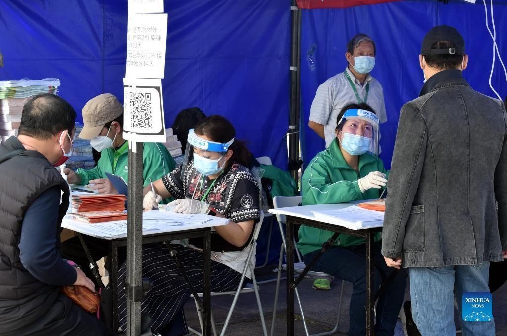 Staff members register information for citizens at Tai Hing Estate in Tuen Mun, south China's Hong Kong, March 4, 2022. The Hong Kong Special Administrative Region (HKSAR) reported 52,523 new COVID-19 cases and 136 deaths on Friday, official data showed. (Xinhua/Lo Ping Fai)