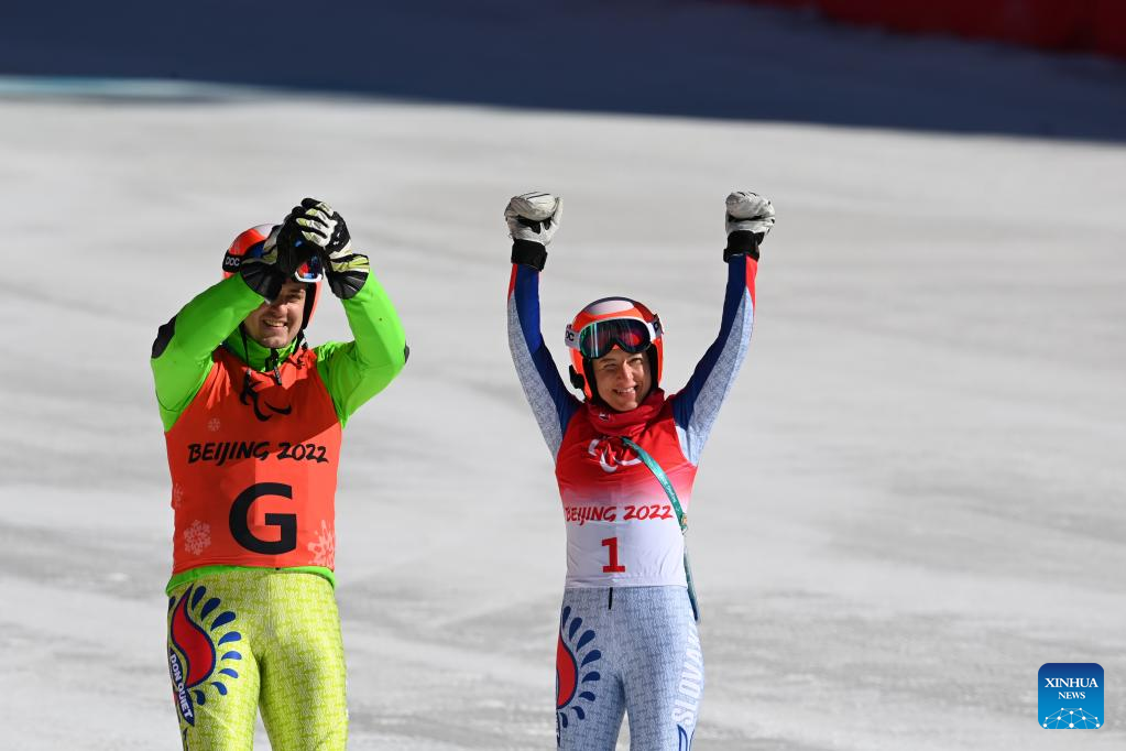 Slovakia's Henrieta Farkasova (R) and her guide Martin Motyka celebrate after the Alpine Skiing Women's Downhill Vision Impaired event of the Beijing 2022 Paralympic Winter Games at the National Alpine Skiing Center in Yanqing District, Beijing, capital of China, March 5, 2022. (Xinhua/Jiang Han)