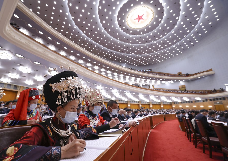 Deputies attend the opening meeting of the fifth session of the 13th National People's Congress (NPC) at the Great Hall of the People in Beijing, capital of China, March 5, 2022. (Xinhua/Liu Weibing)