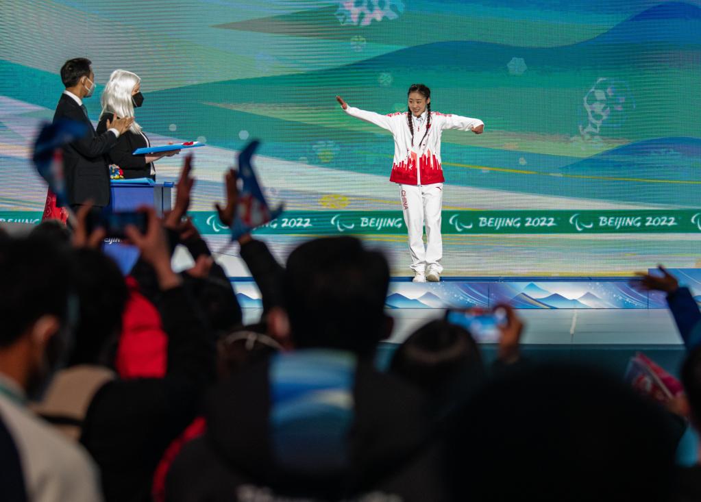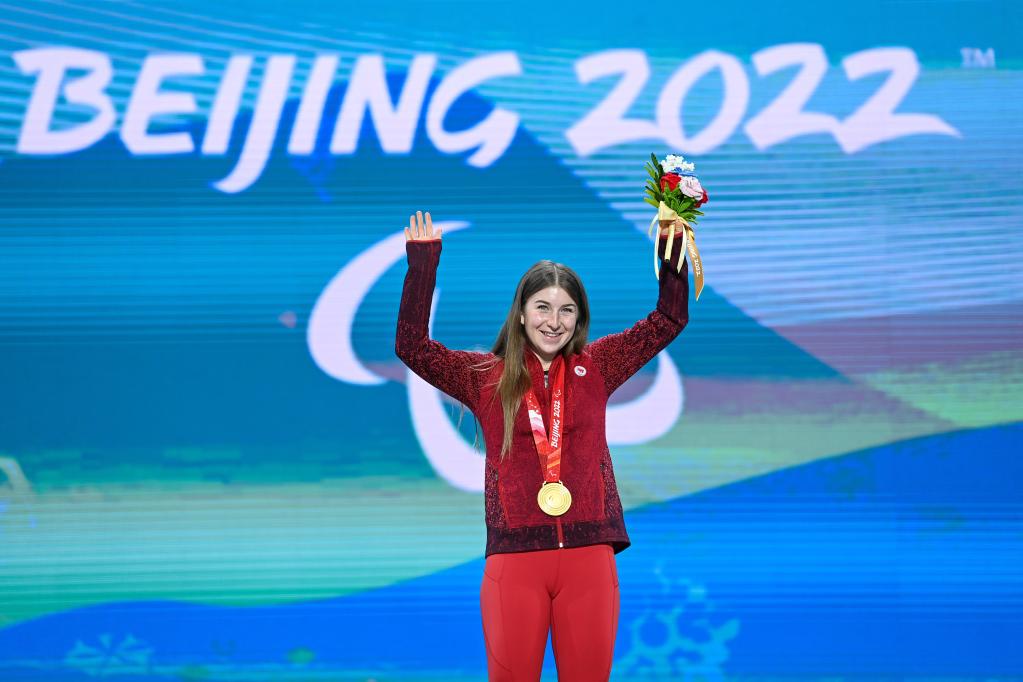 Gold medalist Mollie Jepsen of Canada poses for photo during the awarding ceremony for the para alpine skiing Women's Downhill Standing of Beijing 2022 Paralympic Winter Games at Yanqing Medals Plaza of the Winter Paralympics in Yanqing District, Beijing, capital of China, March. 5, 2022. (Xinhua/Jiang Han)