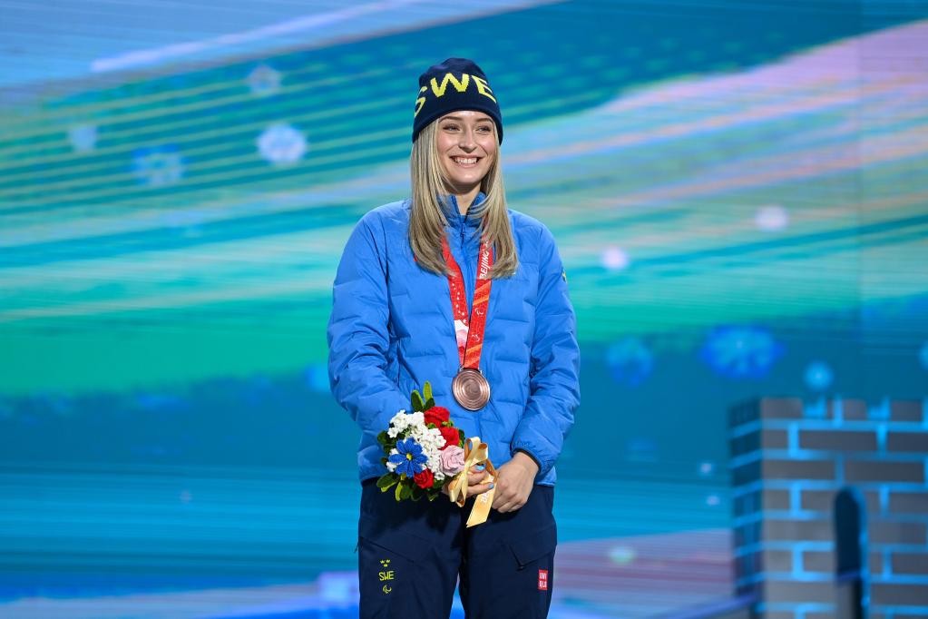 Bronze medalist Ebba Aarsjoe of Sweden poses for photo during the awarding ceremony for the para alpine skiing Women's Downhill Standing of Beijing 2022 Paralympic Winter Games at Yanqing Medals Plaza of the Winter Paralympics in Yanqing District, Beijing, capital of China, March. 5, 2022. (Xinhua/Jiang Han)