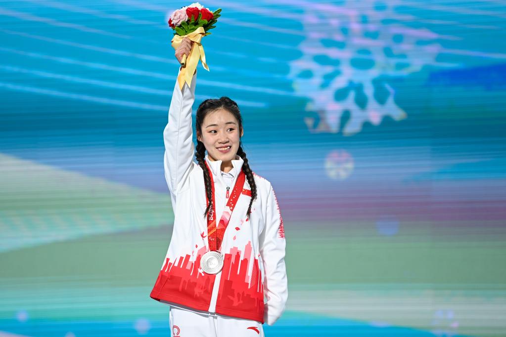 Sliver medalist Zhang Mengqiu(R) of People's Republic of China poses for photo during the awarding ceremony for the para alpine skiing Women's Downhill Standing of Beijing 2022 Paralympic Winter Games at Yanqing Medals Plaza of the Winter Paralympics in Yanqing District, Beijing, capital of China, March. 5, 2022. (Xinhua/Jiang Han)