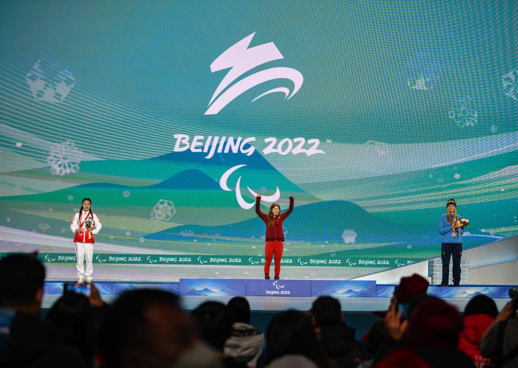 Gold medalist Mollie Jepsen of Canada(C), Sliver medalist Zhang Mengqiu of People's Republic of China(L) and Bronze medalist Ebba Aarsjoe of Sweden pose for photo during the awarding ceremony for the para alpine skiing Women's Downhill Standing of Beijing 2022 Paralympic Winter Games at Yanqing Medals Plaza of the Winter Paralympics in Yanqing District, Beijing, capital of China, March. 5, 2022. (Xinhua/Sun Fei)