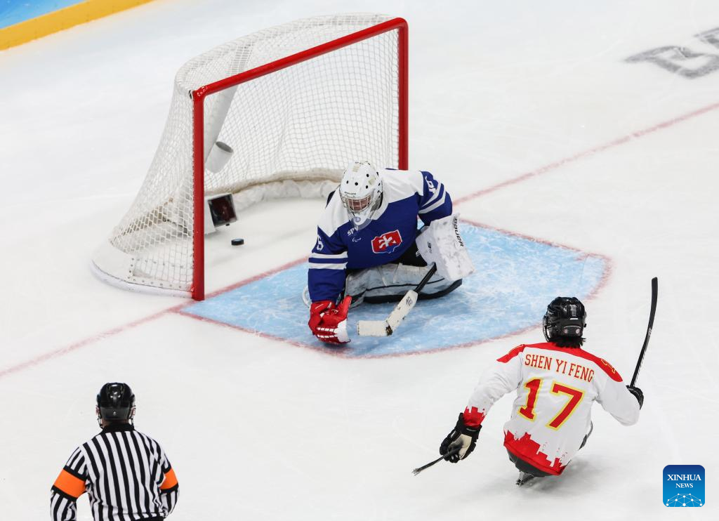Shen Yifeng of China makes a goal during the para ice hockey preliminary round Group B match between China and Slovakia of the Beijing 2022 Paralympic Winter Games at National Indoor Stadium in Beijing, March 5, 2022. (Xinhua/Zhang Keren)