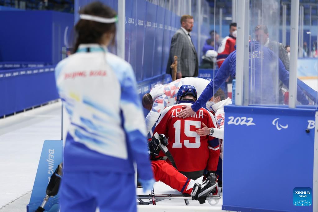 Radek Zelinka of Czech Republic gets treated for injury during the para ice hockey preliminary round Group B match between Czech Republic and Italy of the Beijing 2022 Paralympic Winter Games at National Indoor Stadium in Beijing, March 5, 2022. (Xinhua/Hu Xingyu)