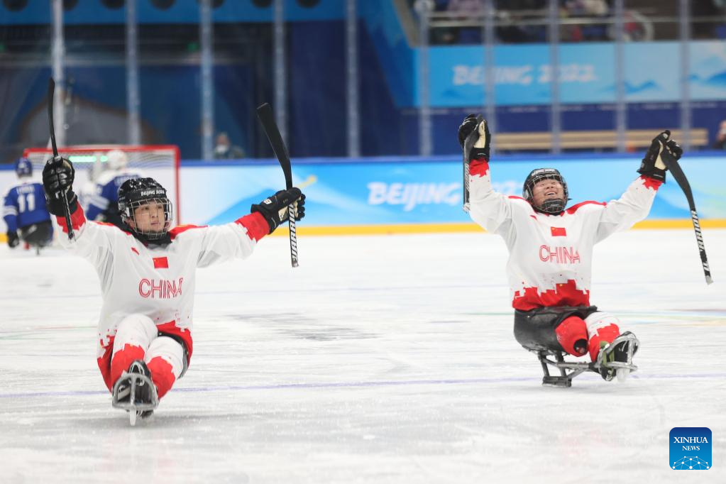Xu Jinqiang(R) and Zhu Zhanfu of China celebrates scoring during the para ice hockey preliminary round Group B match between China and Slovakia of the Beijing 2022 Paralympic Winter Games at National Indoor Stadium in Beijing, March 5, 2022. (Xinhua/Ma Xiping)