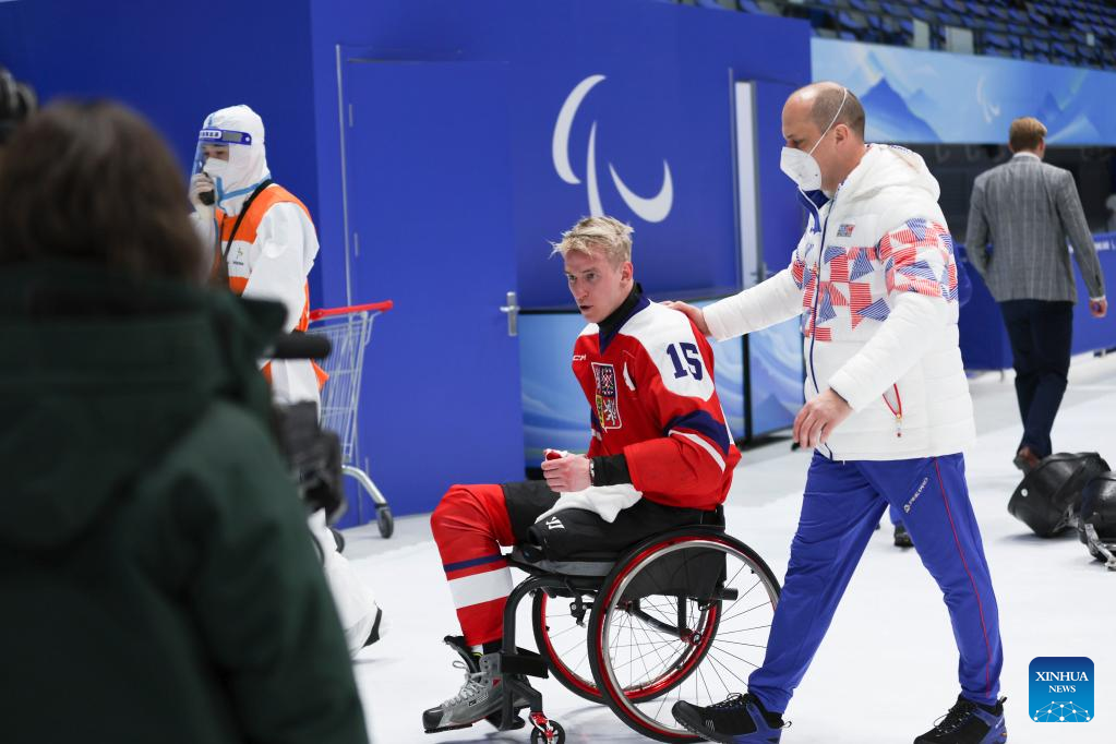 Radek Zelinka of Czech Republic leaves the court during the para ice hockey preliminary round Group B match between Czech Republic and Italy of the Beijing 2022 Paralympic Winter Games at National Indoor Stadium in Beijing, March 5, 2022. (Xinhua/Hu Xingyu)
