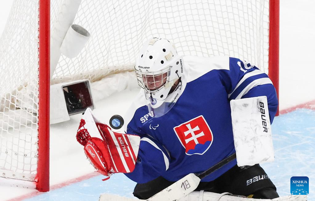 Eduard Lepacek of Slovakia saves a goal during the para ice hockey preliminary round Group B match between China and Slovakia of the Beijing 2022 Paralympic Winter Games at National Indoor Stadium in Beijing, March 5, 2022. (Xinhua/Zhang Keren)