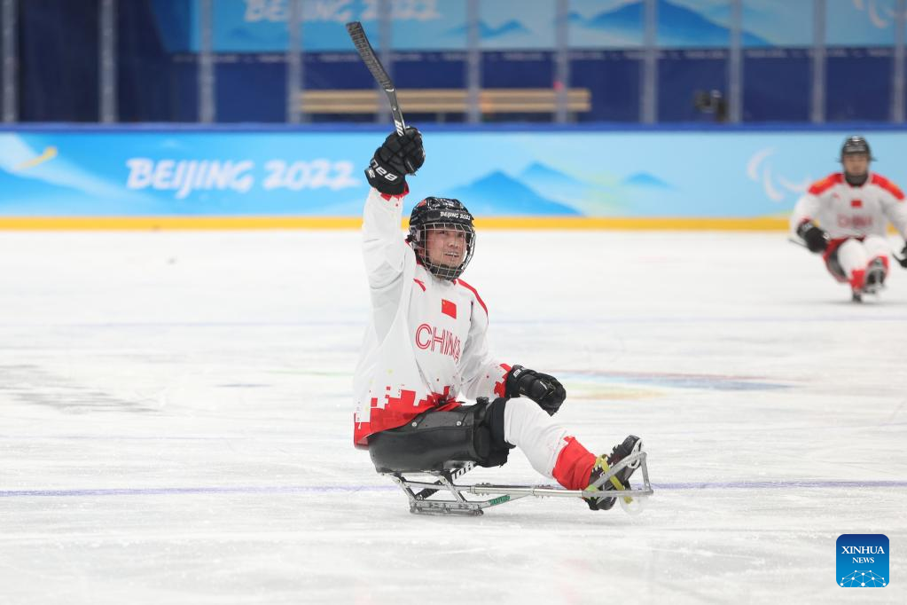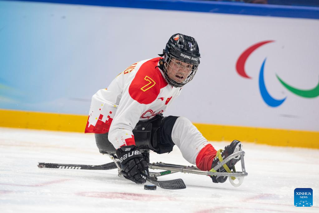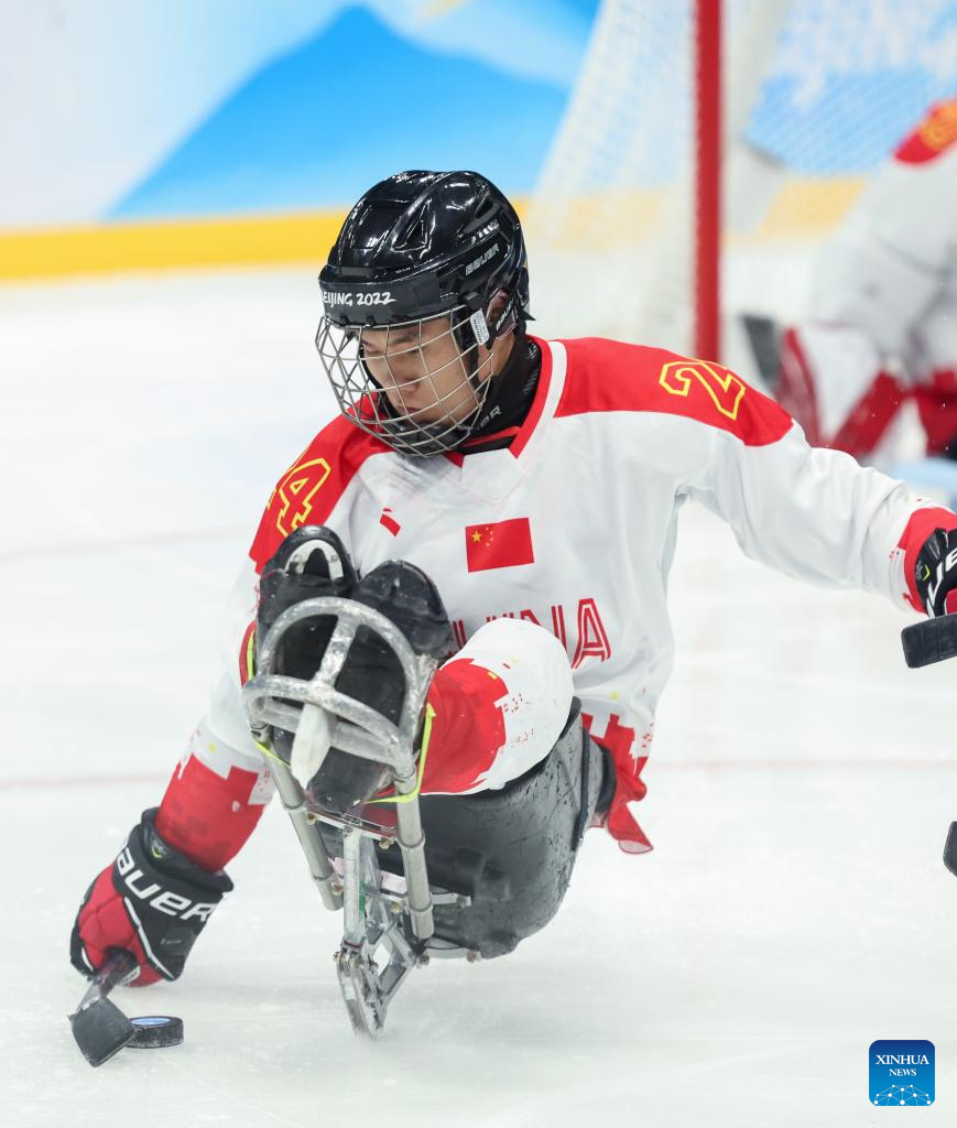 Zhu Zhanfu of China compete during the para ice hockey preliminary round Group B match between China and Slovakia of the Beijing 2022 Paralympic Winter Games at National Indoor Stadium in Beijing, March 5, 2022. (Xinhua/Zhang Keren)