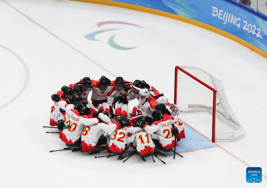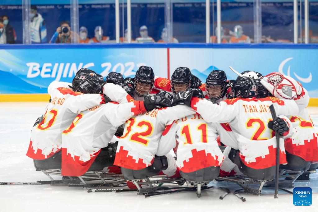 Players of China cheer for each other before the para ice hockey preliminary round Group B match between China and Slovakia of the Beijing 2022 Paralympic Winter Games at National Indoor Stadium in Beijing, March 5, 2022. (Xinhua/Zhang Keren)