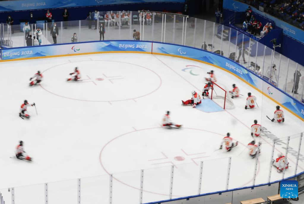 Players of China are seen before the para ice hockey preliminary round Group B match between China and Slovakia of the Beijing 2022 Paralympic Winter Games at National Indoor Stadium in Beijing, March 5, 2022. (Xinhua/Cai Yang)