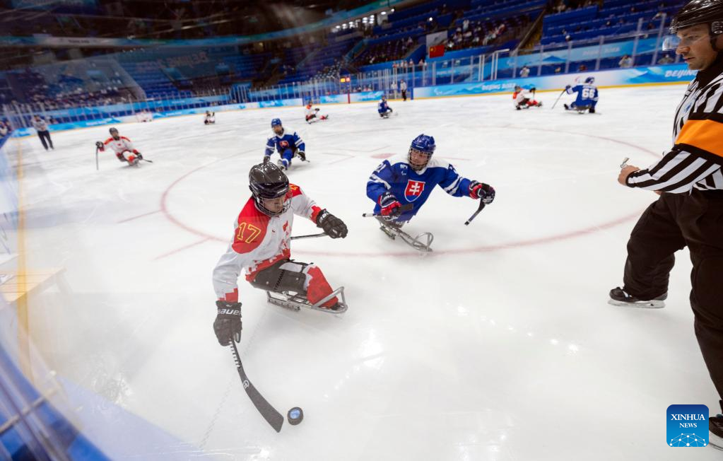 Wang Zhidong (R middle) of China and Marian Ligda (L middle) of Slovakia compete during the para ice hockey preliminary round Group B match between China and Slovakia of the Beijing 2022 Paralympic Winter Games at National Indoor Stadium in Beijing, March 5, 2022. (Xinhua/Zhang Keren)