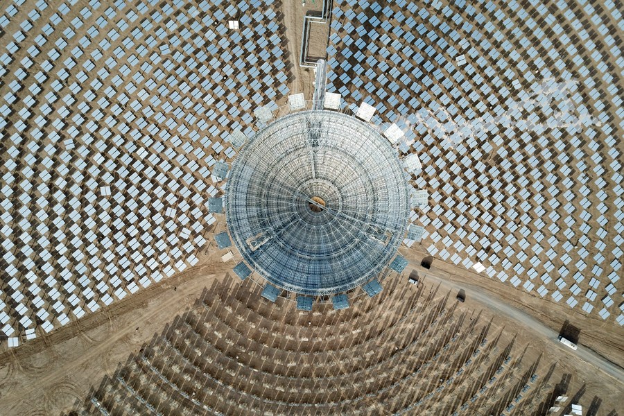Aerial photo taken on Dec. 8, 2021 shows a molten-salt solar thermal power plant in Yumen City, northwest China's Gansu Province. (Xinhua/Fan Peishen)