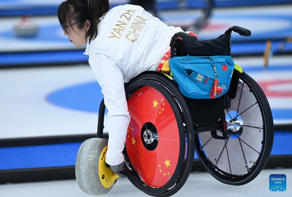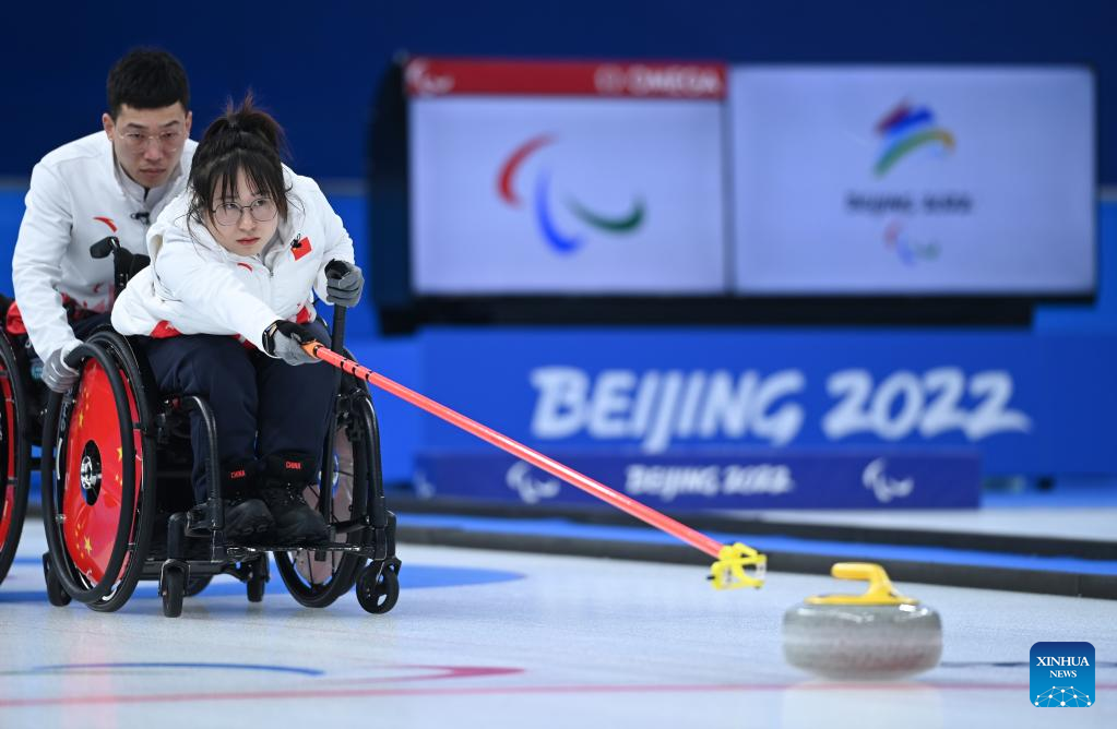 Yan Zhuo (R) of China competes during the Wheelchair Curling Round Robin Match between Estonia and China of Beijing 2022 Paralympic Winter Games at National Aquatics Center in Beijing, capital of China on March 6, 2022. (Xinhua/Zhang Bowen)