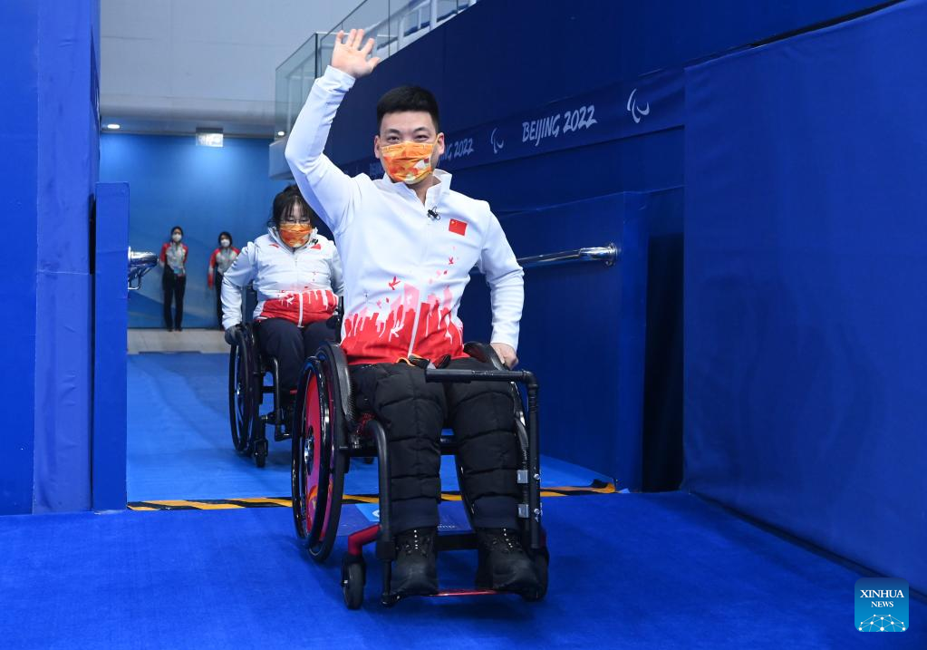 Wang Haitao and Yan Zhuo(L) of China react during the Wheelchair Curling Round Robin Match between Estonia and China of Beijing 2022 Paralympic Winter Games at National Aquatics Center in Beijing, capital of China, on March 6, 2022. (Xinhua/Ren Chao)