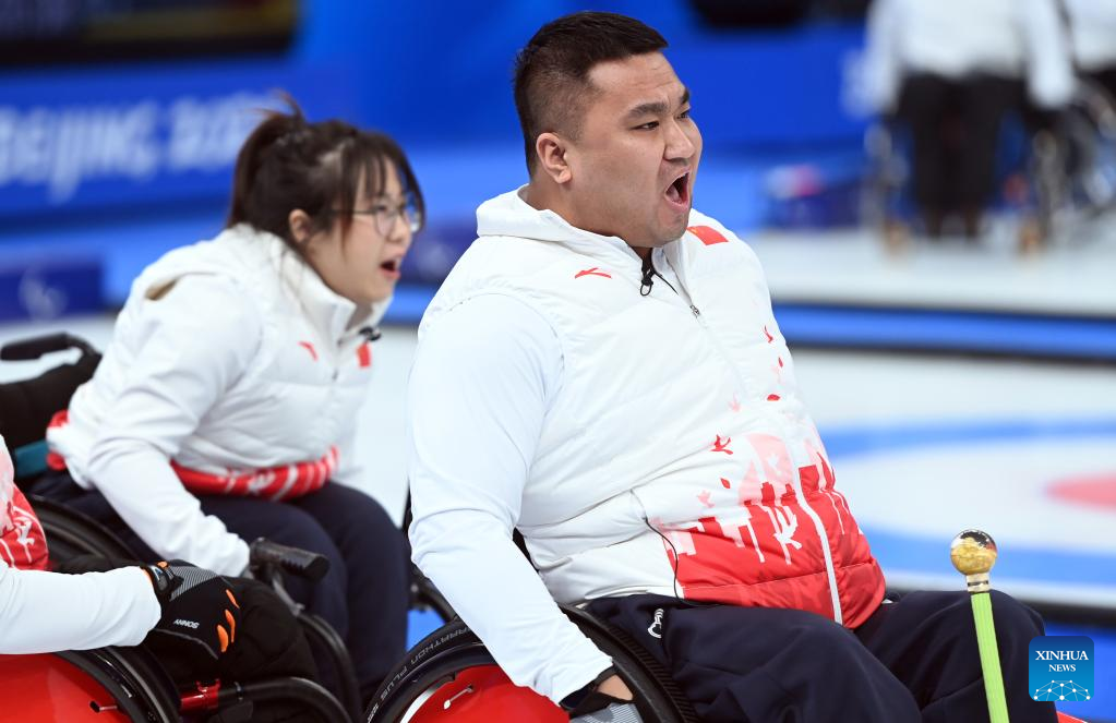 Yan Zhuo of China reacts during the Wheelchair Curling Round Robin Match between Estonia and China of Beijing 2022 Paralympic Winter Games at National Aquatics Center in Beijing, capital of China on March 6, 2022. (Xinhua/Zhang Bowen)