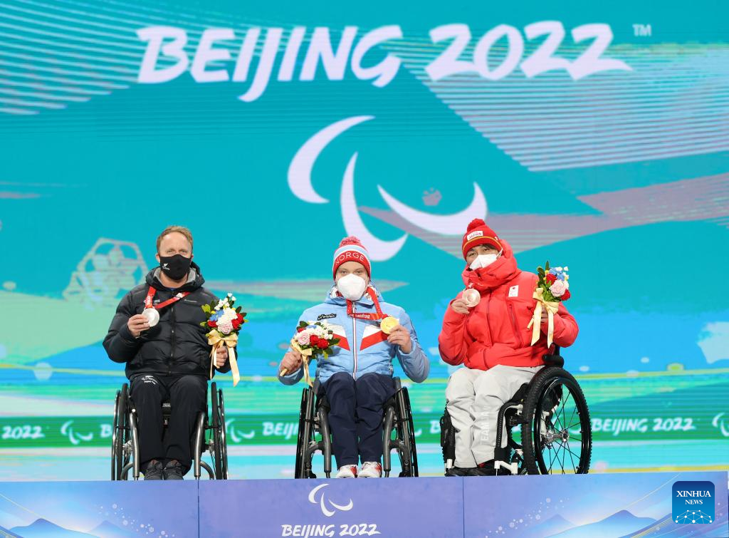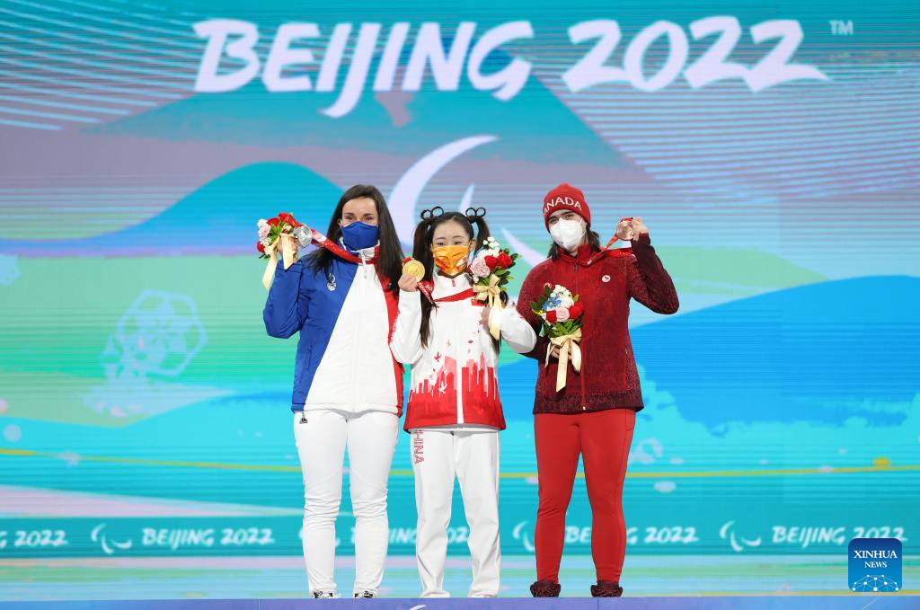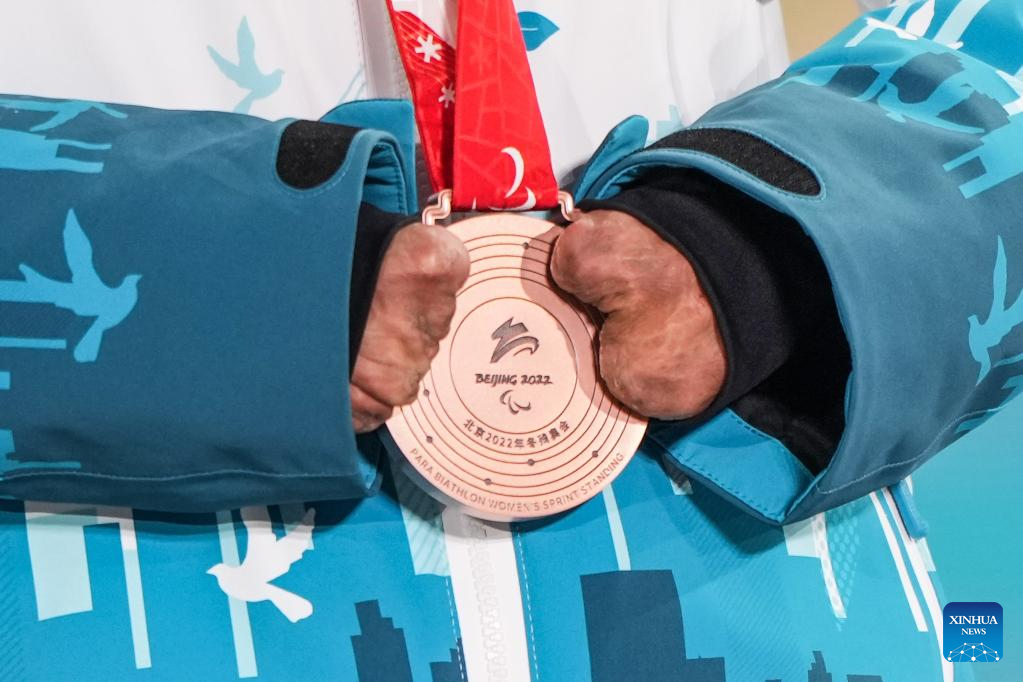 Gold medalist Guo Yujie of China poses for a photo during the awarding ceremony of Para Biathlon Women's Sprint Standing of Beijing 2022 Paralympic Winter Games at Zhangjiakou Medals Plaza in Zhangjiakou, north China's Hebei Province, March 6, 2022. (Xinhua/Jia Haocheng)