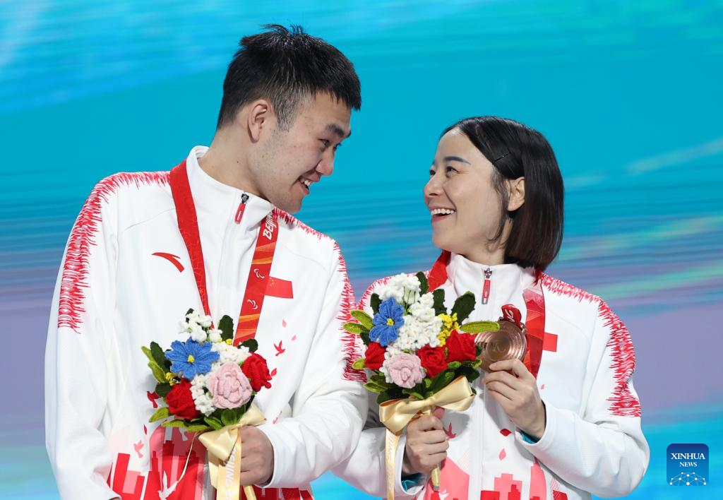 Bronze medalist Zhu Daqing(R) of China and her guide Yan Hanhan pose for a photo during the awarding ceremony for the Alpine Skiing Women's Super-G Vision Impaired of Beijing 2022 Paralympic Winter Games at Yanqing Medals Plaza of the Winter Paralympics in Yanqing District, Beijing, capital of China, March 6, 2022. (Xinhua/Li Jianan)