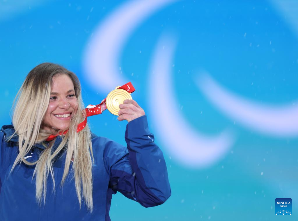 Gold medalist Zhang Mengqiu of China poses for a photo during the awarding ceremony for the Alpine Skiing Women's Super-G Standing of Beijing 2022 Paralympic Winter Games at Yanqing Medals Plaza of the Winter Paralympics in Yanqing District, Beijing, capital of China, March 6, 2022. (Xinhua/Luo Yuan)