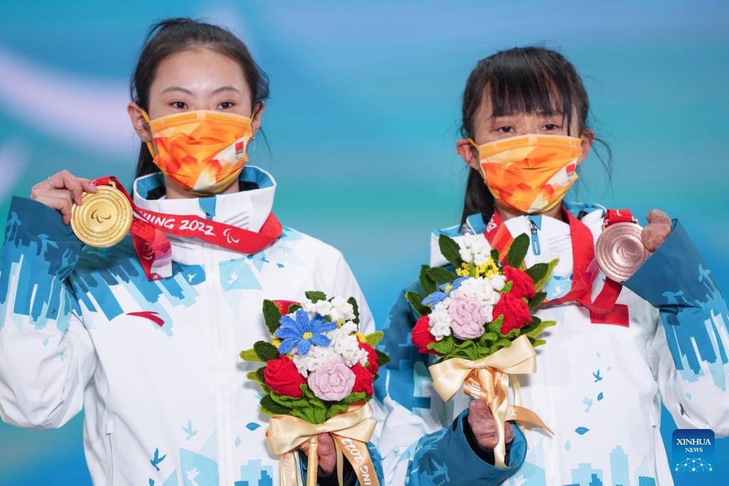 Gold medalist Guo Yujie of China(L) and Bronze medalist Zhao Zhiqing of China pose for a photo during the awarding ceremony of Para Biathlon Women's Sprint Standing of Beijing 2022 Paralympic Winter Games at Zhangjiakou Medals Plaza in Zhangjiakou, north China's Hebei Province, March 6, 2022. (Xinhua/Peng Ziyang)
