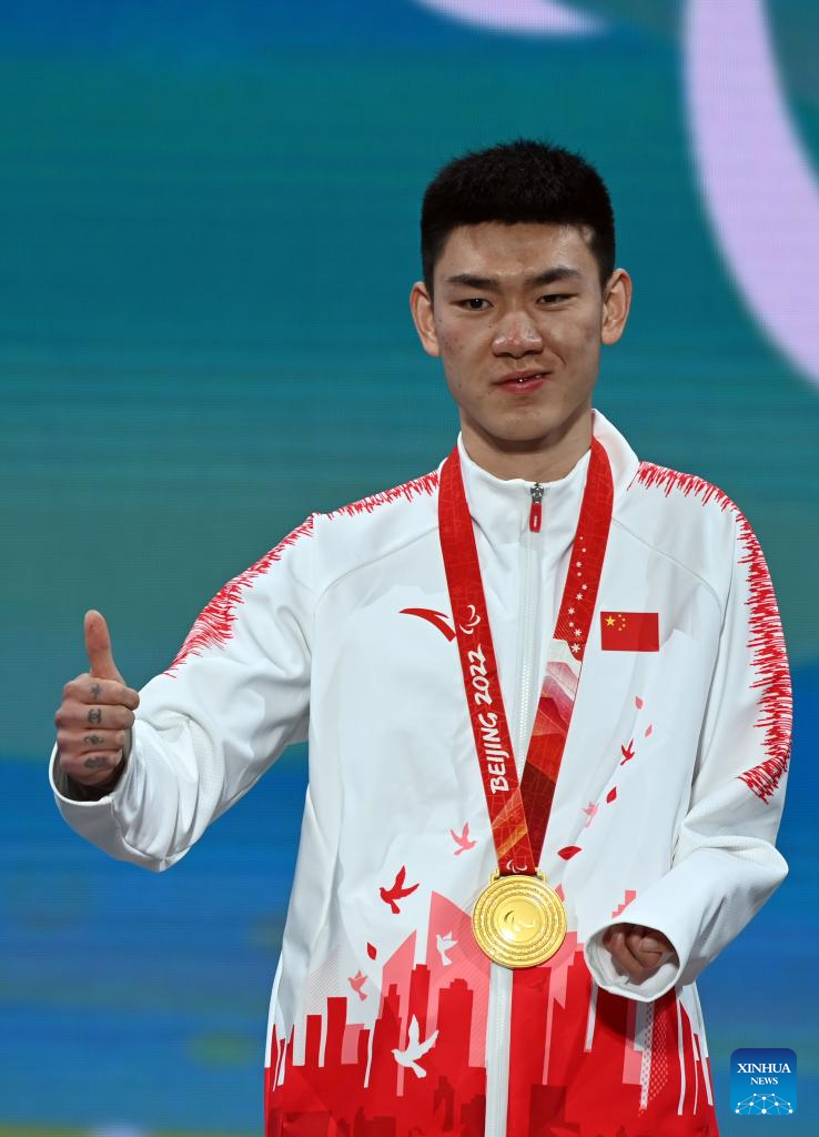 Gold medalist Liu Zixu of China poses for a photo during the awarding ceremony of Para Biathlon Men's Sprint Sitting of Beijing 2022 Paralympic Winter Games at Zhangjiakou Medals Plaza in Zhangjiakou, north China's Hebei Province, March 6, 2022. (Xinhua/Peng Ziyang)