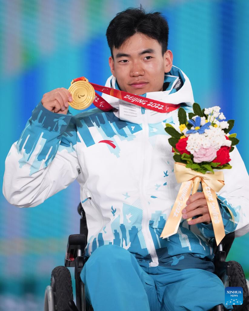 Gold medalist Liang Jingyi of China poses for a photo during the awarding ceremony for the Alpine Skiing Men's Super-G Standing of Beijing 2022 Paralympic Winter Games at Yanqing Medals Plaza of the Winter Paralympics in Yanqing District, Beijing, capital of China, March 6, 2022. (Xinhua/Li Jianan)