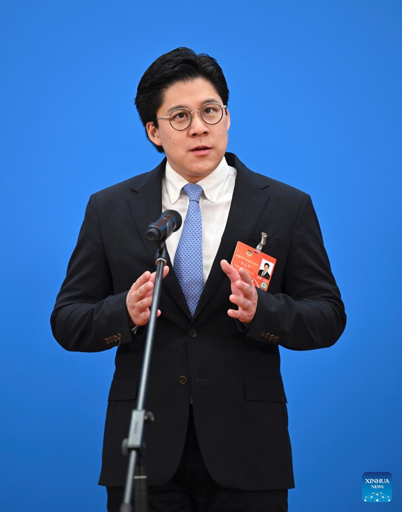 Kenneth Fok Kai-kong, a member of the 13th National Committee of the Chinese People's Political Consultative Conference (CPPCC), attends an interview via video link ahead of the second plenary meeting of the fifth session of the 13th CPPCC National Committee at the Great Hall of the People in Beijing, capital of China, March 7, 2022. (Xinhua/Jin Liangkuai)