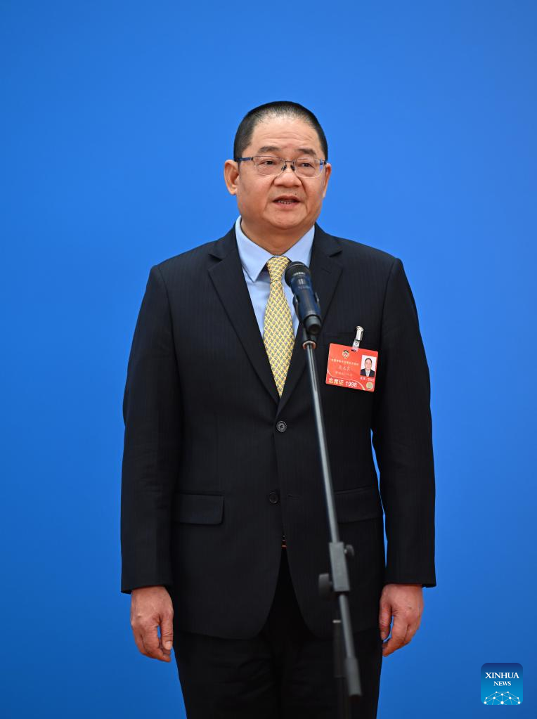Sun Dehong, a member of the 13th National Committee of the Chinese People's Political Consultative Conference (CPPCC), attends an interview via video link ahead of the second plenary meeting of the fifth session of the 13th CPPCC National Committee at the Great Hall of the People in Beijing, capital of China, March 7, 2022. (Xinhua/Jin Liangkuai)