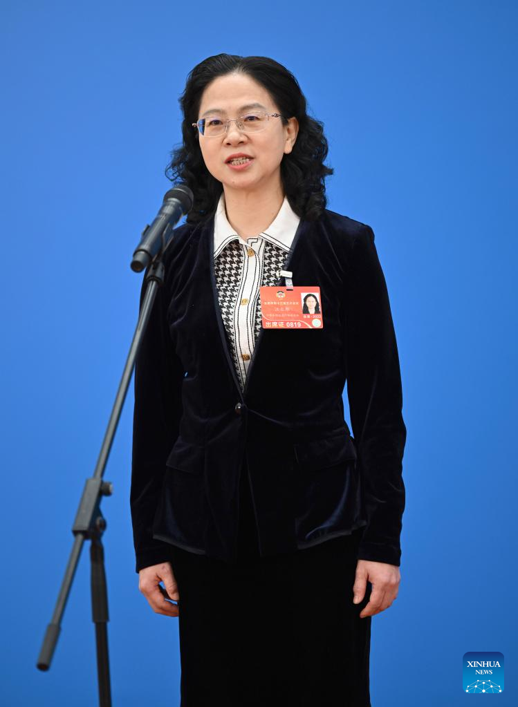 Hu Wei, a member of the 13th National Committee of the Chinese People's Political Consultative Conference (CPPCC), attends an interview via video link ahead of the second plenary meeting of the fifth session of the 13th CPPCC National Committee at the Great Hall of the People in Beijing, capital of China, March 7, 2022. (Xinhua/Jin Liangkuai)