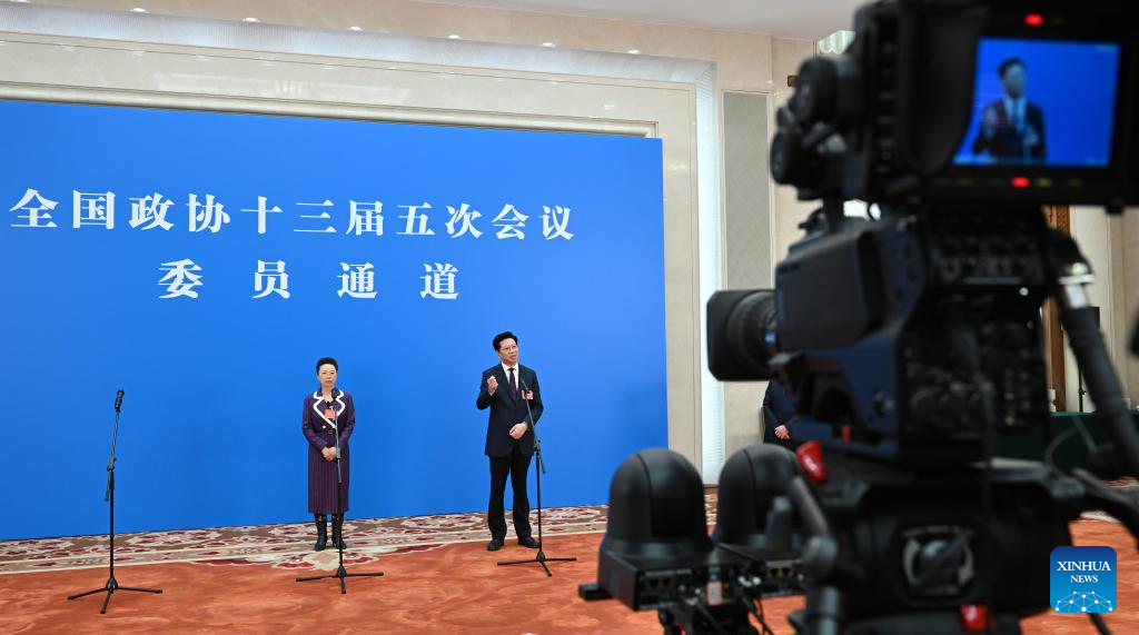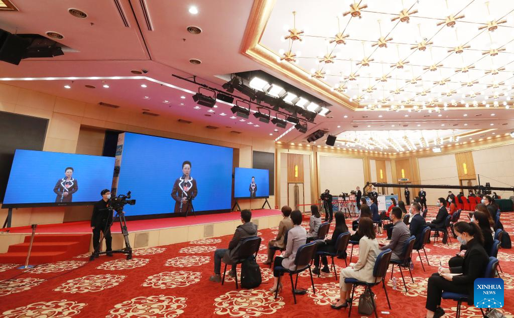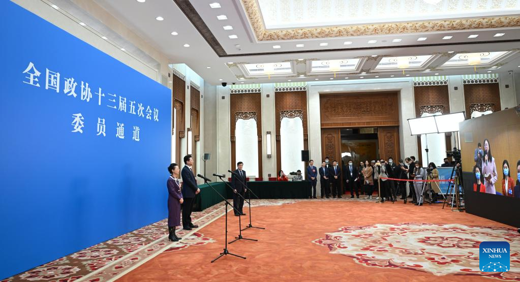 Members of the 13th National Committee of the Chinese People's Political Consultative Conference (CPPCC) are interviewed via video link ahead of the second plenary meeting of the fifth session of the 13th CPPCC National Committee at the Great Hall of the People in Beijing, capital of China, March 7, 2022. (Xinhua/Jin Liangkuai)