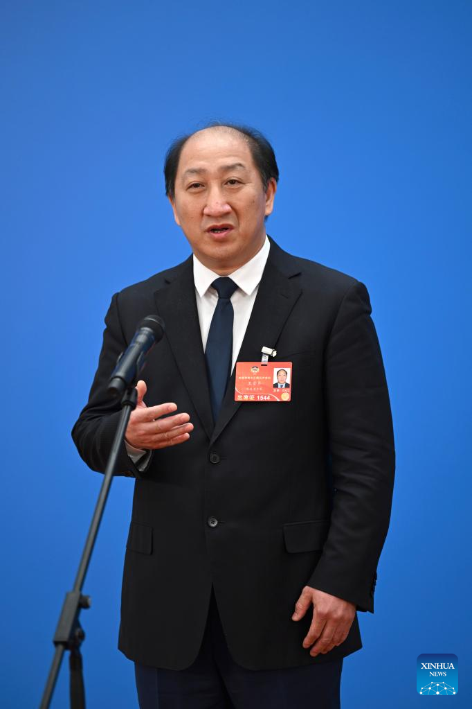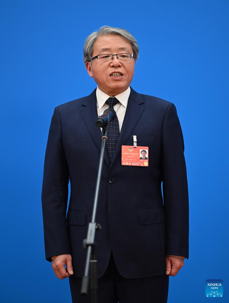 Wang Guiqi, a member of the 13th National Committee of the Chinese People's Political Consultative Conference (CPPCC), attends an interview via video link ahead of the second plenary meeting of the fifth session of the 13th CPPCC National Committee at the Great Hall of the People in Beijing, capital of China, March 7, 2022. (Xinhua/Jin Liangkuai)
