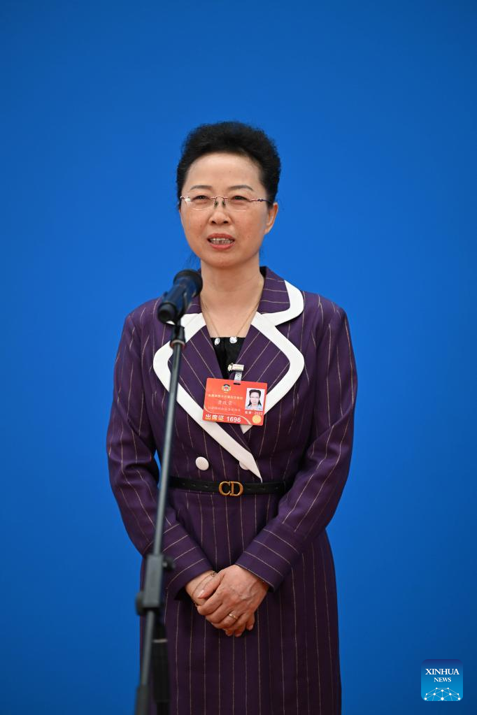 Huang Gairong, a member of the 13th National Committee of the Chinese People's Political Consultative Conference (CPPCC), attends an interview via video link ahead of the second plenary meeting of the fifth session of the 13th CPPCC National Committee at the Great Hall of the People in Beijing, capital of China, March 7, 2022. (Xinhua/Jin Liangkuai)