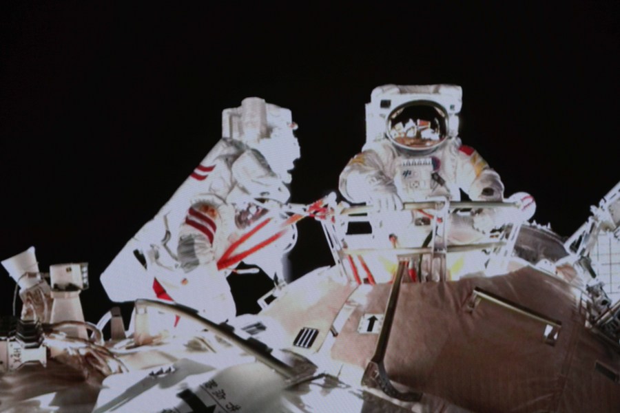 Screen image taken at Beijing Aerospace Control Center on Nov. 8, 2021 shows Chinese taikonaut Wang Yaping (R) completing extravehicular activities (EVAs). (Photo by Guo Zhongzheng/Xinhua)