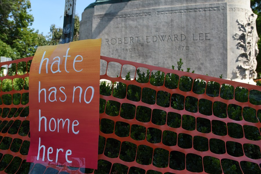 A poster saying "hate has no home here" is seen in Charlottesville, Virginia, the United States, on Aug. 10, 2018. (Xinhua/Yang Chenglin)
