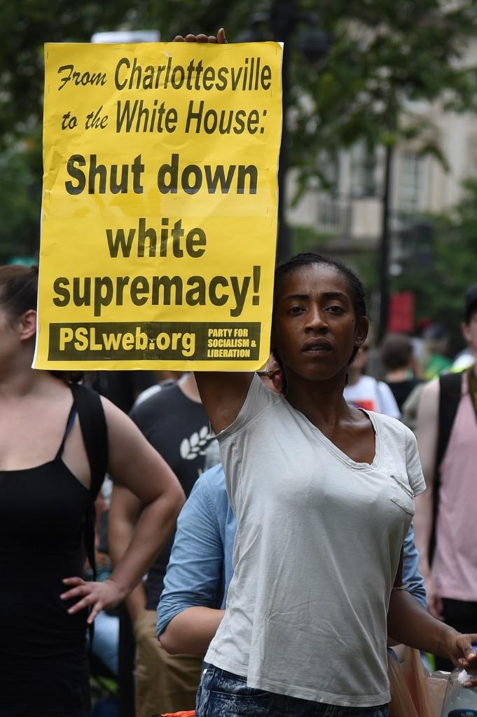 An anti-protester holds a placard in front of the white supremacist-led rally near the White House, in Washington, D.C., the United States, on Aug. 12, 2018. (Xinhua/Yang Chenglin)