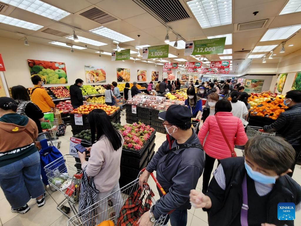 People select vegetables in a supermarket in Hong Kong, south China, March 1, 2022. (Xinhua/Wang Shen)