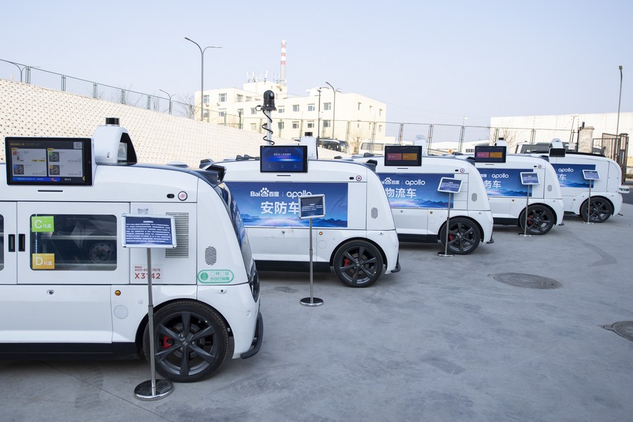 Unmanned vehicles are seen at Apollo Park in Yangquan, north China's Shanxi Province, Feb. 25, 2022. (Xinhua/Yang Chenguang)