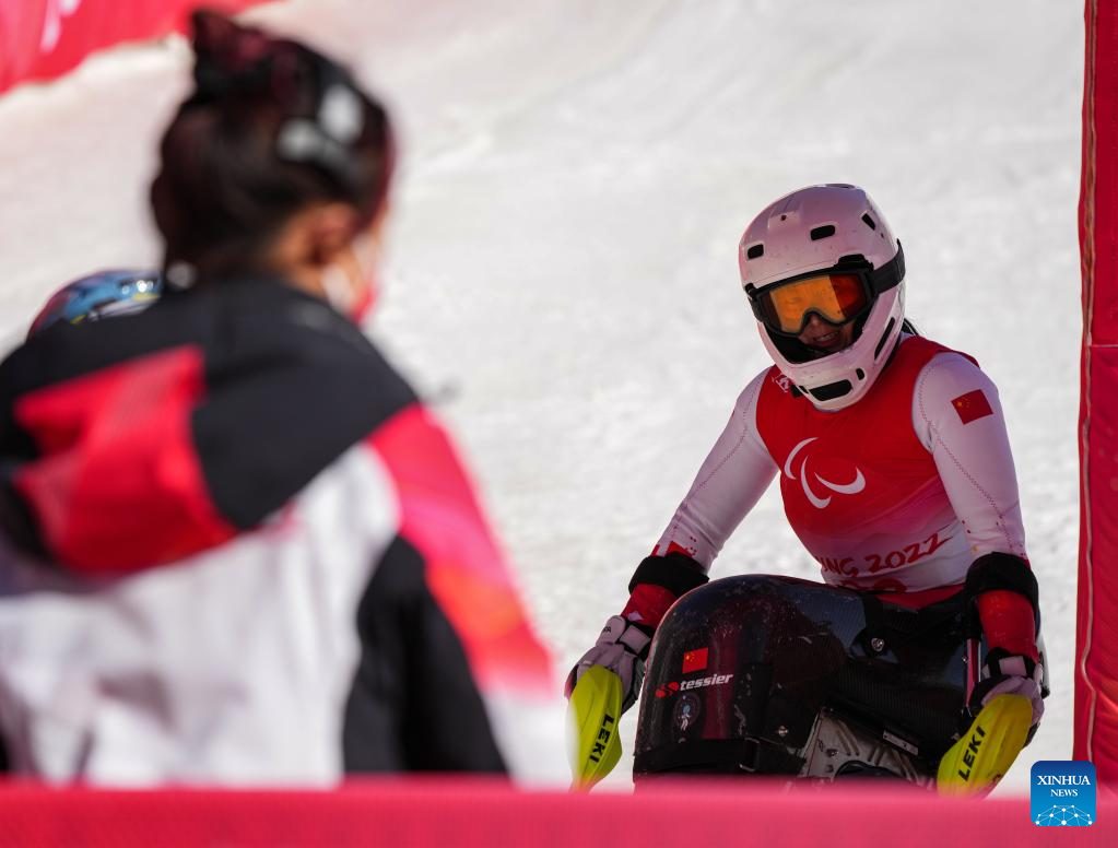 Liu Sitong (R) of China reacts after the para alpine skiing Women's Super Combined Sitting of Beijing 2022 Winter Paralympic Games at National Alpine Skiing Centre in Yanqing District, Beijing, capital of China, March. 7, 2022. (Xinhua/Sun Fei)