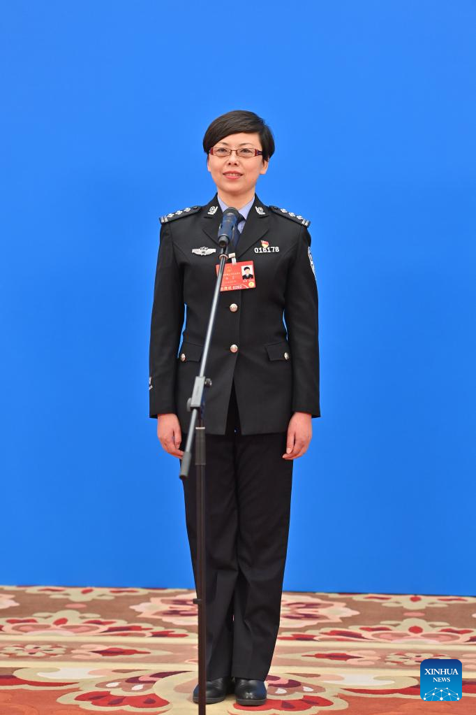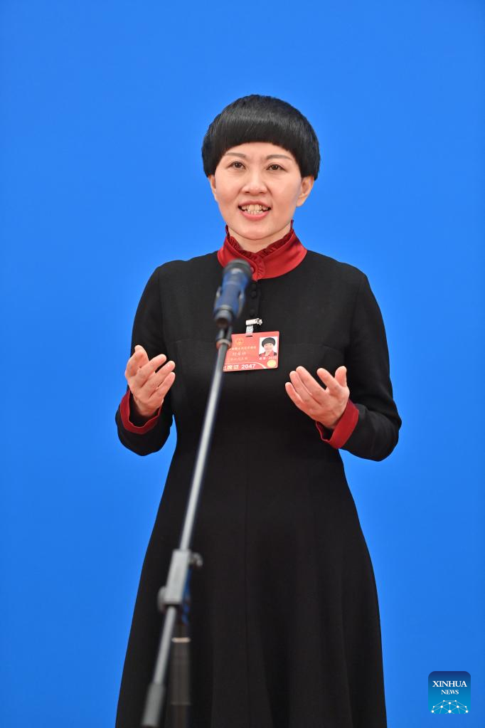 Wang Xiaofei, a deputy to the 13th National People's Congress (NPC), attends an interview via video link ahead of the second plenary meeting of the fifth session of the 13th NPC in Beijing, capital of China, March 8, 2022. (Xinhua/Li Xin)