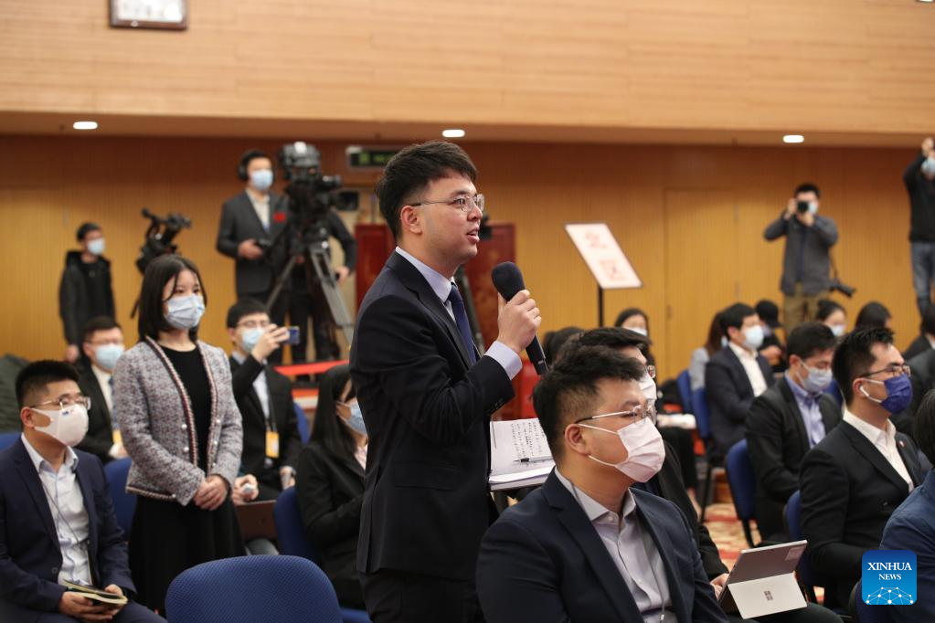 A journalist asks a question during an interview attended by deputies to the 13th National People's Congress (NPC) via video link ahead of the second plenary meeting of the fifth session of the 13th NPC in Beijing, capital of China, March 8, 2022. (Xinhua/Yin Gang)