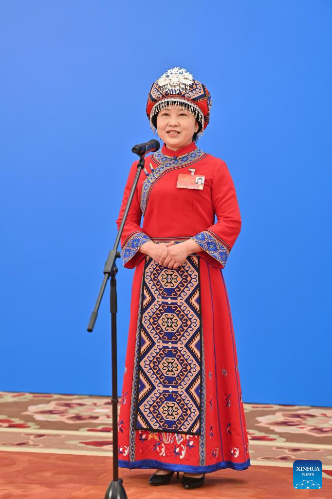 Ge Minghua, a deputy to the 13th National People's Congress (NPC), attends an interview via video link ahead of the second plenary meeting of the fifth session of the 13th NPC in Beijing, capital of China, March 8, 2022. (Xinhua/Li Xin)