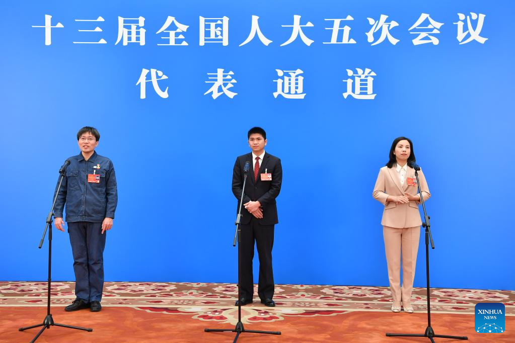 Deputies to the 13th National People's Congress (NPC) Lu Wenjun, Yang Rong and Ge Minghua (from R to L) attend an interview via video link ahead of the second plenary meeting of the fifth session of the 13th NPC in Beijing, capital of China, March 8, 2022. (Xinhua/Li Xin)
