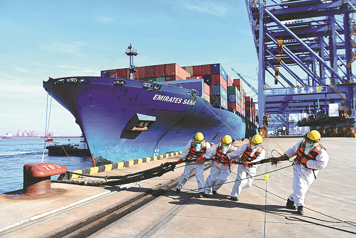 Workers help moor a freighter in Qingdao, Shandong province. [Photo by Yu Fangping/For China Daily]