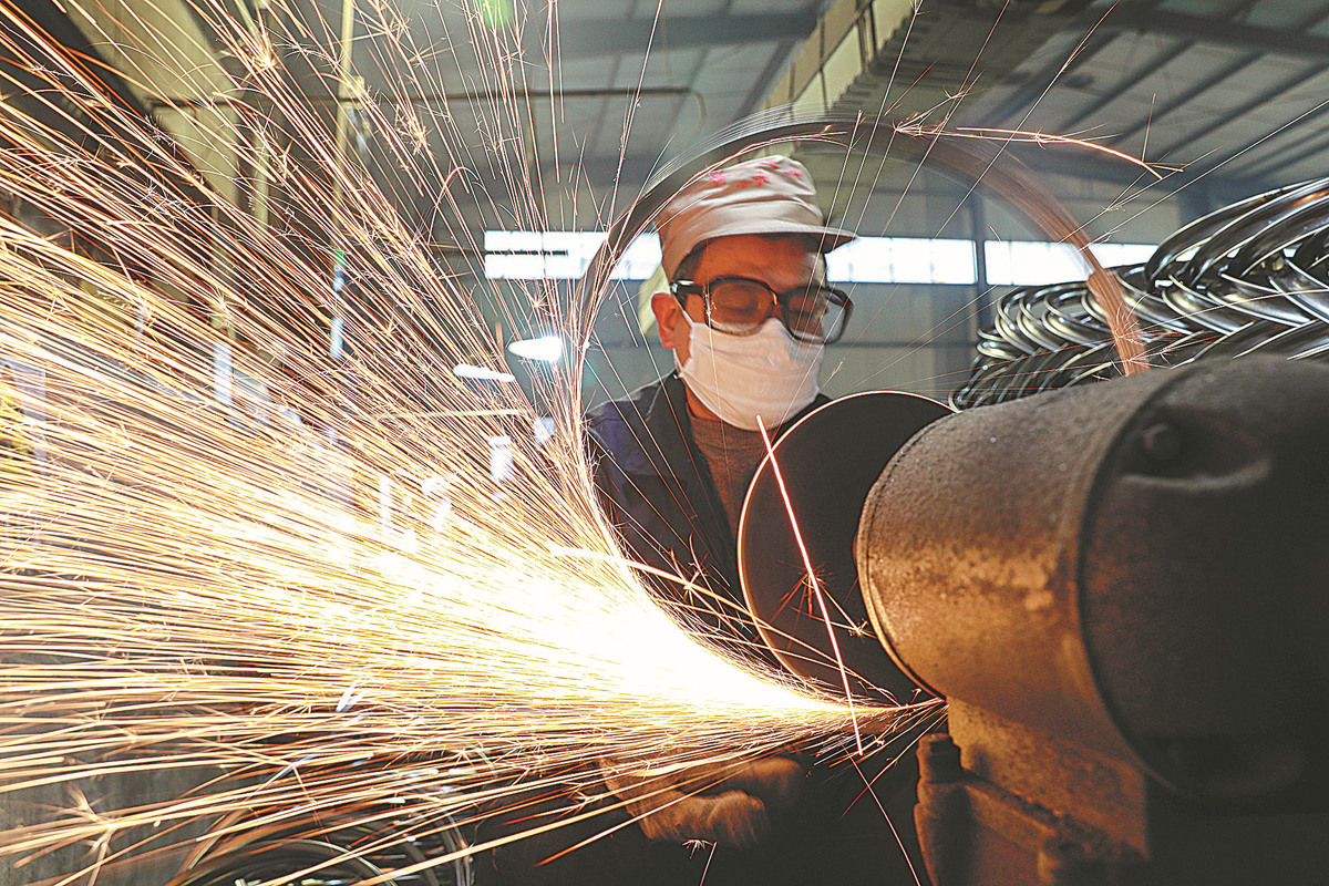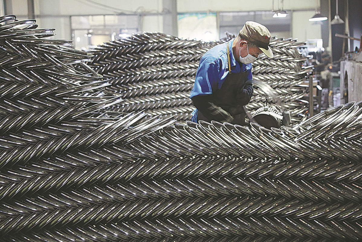 A worker polishes bicycle tire rims at a factory for exports in Hangzhou, Zhejiang province.[Photo by Hu Jianhuan/For China Daily]