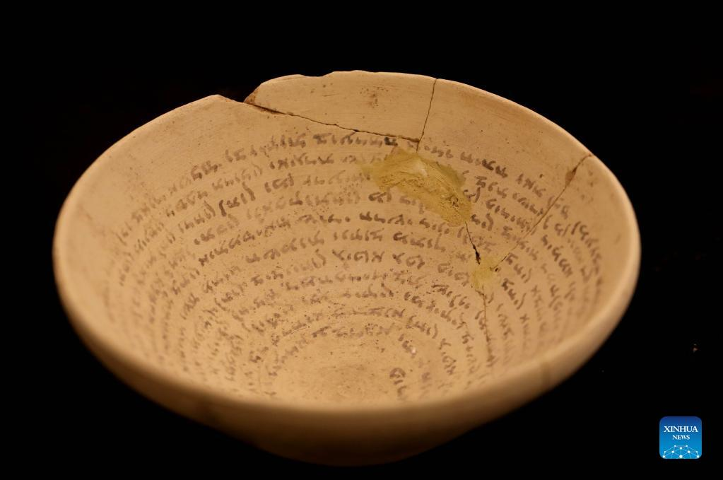 Photo taken on March 7, 2022 shows an ancient magical bowl in Jerusalem. Ancient magical bowls, carrying spells and incantations scripts in the Hebrew and Babylonian-Aramaic languages, were uncovered in Jerusalem, the Israel Antiquities Authority (IAA) said on Monday. (Photo by Gil Cohen Magen/Xinhua)