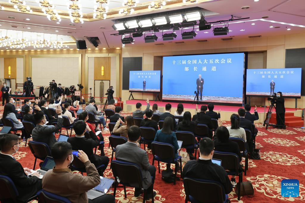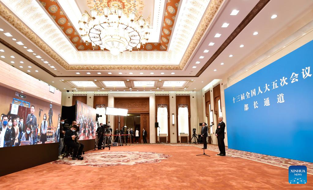 A journalist asks questions via video link in an interview attended by ministers after the second plenary meeting of the fifth session of the 13th National People's Congress (NPC) in Beijing, capital of China, March 8, 2022. (Xinhua/Yin Gang)